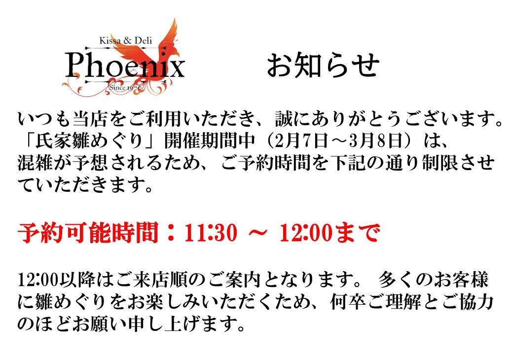 2026.01.12 お知らせ 氏家雛巡り期間中のご予約について 雛巡り期間のご予約が増えております。何卒、ご理解の程よろしくお長い致します。尚、テラス席につきましては終日、ご予約は受けておりません。 店舗ブログ一覧